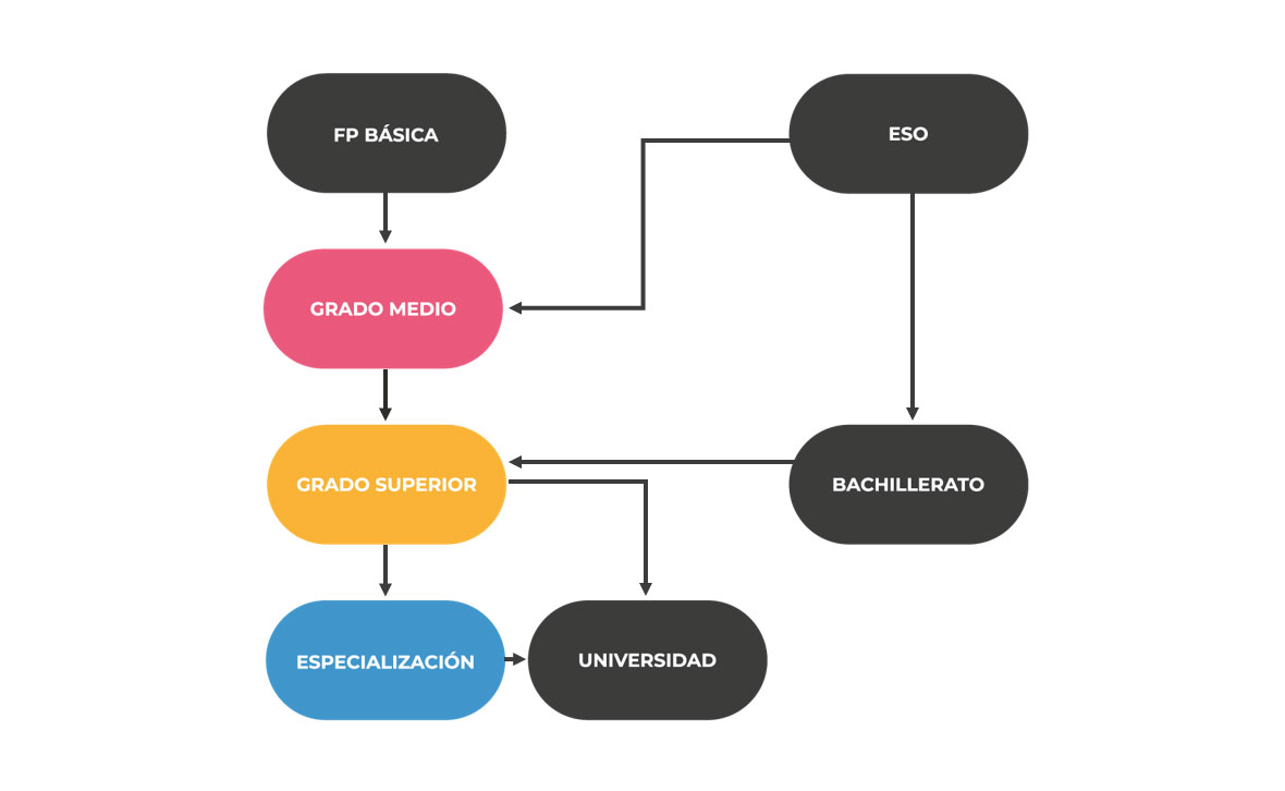 Jarraian agertzen den grafikoan Lanbide Heziketako titulazioetara sartzeko bide desberdinak ikus daitezke, zure egoera akademikoaren arabera.